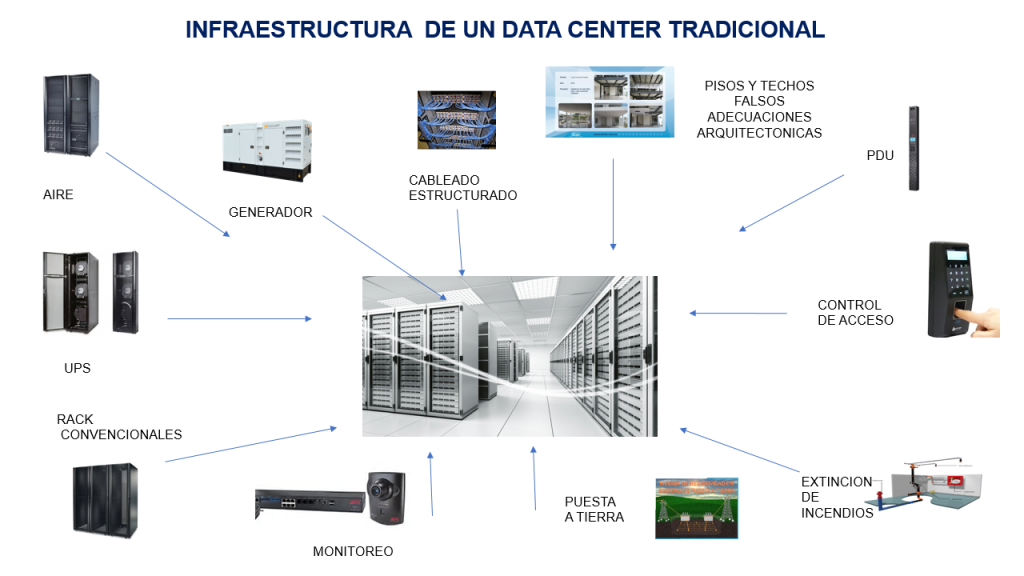 Un data center convencional es un Equipo de procesamiento de datos, una maquina empleada para albergar un sistema de información de componentes asociados de telecomunicaciones, servidores y equipos de almacenamientos bajo un ambiente controlado donde se incluyen fuentes de alimentación redundante, sistema de respaldo UPS, aire acondicionado, sistema de extinción de incendios y diferentes dispositivos de seguridad como CCTV, control de acceso, monitoreo. Garantizando una operación 7×24 de los equipos permitiendo acceso a la información de sus clientes, sus empleados y sus proveedores de manera ininterrumpida.